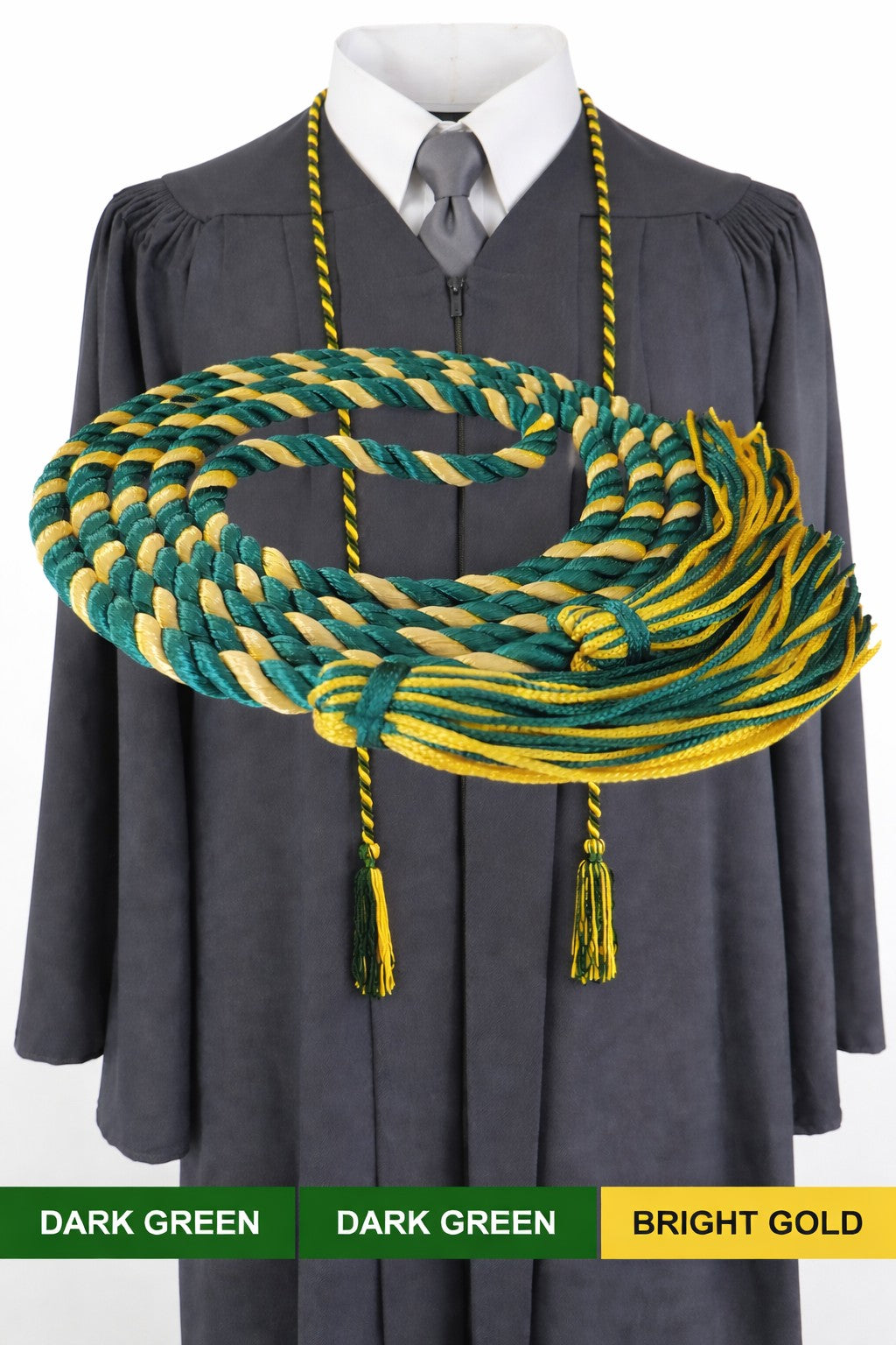 This two-color recognition cord for graduates features dark green and bright gold cording, with dark green being the dominant color, intertwined to form a single cord complete with matching tassels at each end. Honor and recognition cords are designed to be worn with the graduation cap and gown to bring visual recognition to the graduate for academic achievement or membership in a particular academic organization.
